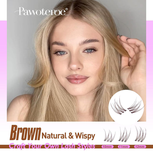 Pawotence Brown Lash Extension Kit Lash Clusters Wispy clear Band 10-12mm Individual Lashes Natural Brown Clusters Eyelash Extension Kit with Lash Bond and Seal, Lash Applicator for Self Use