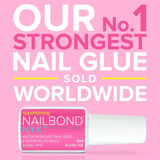Super Strong Nail Glue for Press On Nails, Nail Tips & Acrylic Nails (8ml) NYK1 NailBond Brush On Glue for Press Ons, Tips & Acrylics - Long Lasting, Maximum Strength, Mess-Free Application