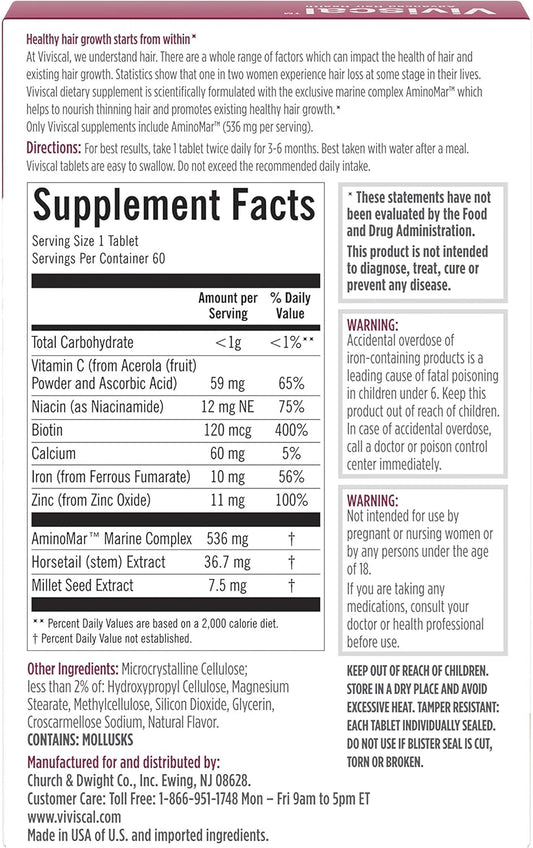 Viviscal Women's Hair Growth Supplement – Nourish Thinning Hair and Increase Hair Thickness – With AminoMar Collagen, Biotin, Zinc, Vitamin C, and Iron – 60 Tablets (30-Day Supply)