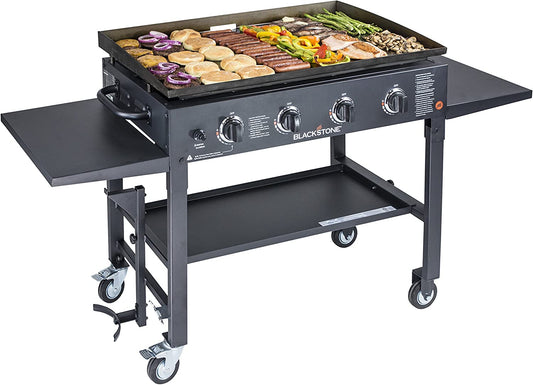 Blackstone 36 Inch Gas Griddle Cooking Station 4 Burner Flat Top Gas Grill Propane Fueled Restaurant Grade Professional 36” Outdoor Griddle Station with Side Shelf (1554)