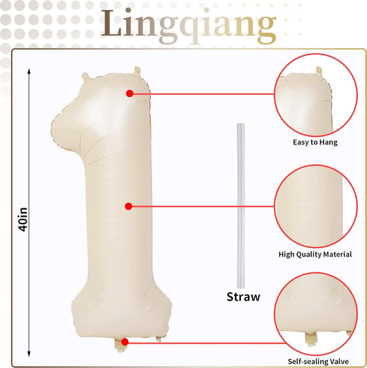 40 Inch Beige Number 1 Balloon for 1st Birthday Decoration, Large Self Inflating Cream Foil Number Balloons 0-9 for Boys Girls, White Sand 1 Helium Balloons for Women Men Party Anniversary Supplies